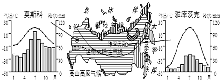 (1)俄羅斯分布面積最廣的氣候類型是氣候。俄羅斯大部分地區(qū)冬季漫長寒冷,原因是。